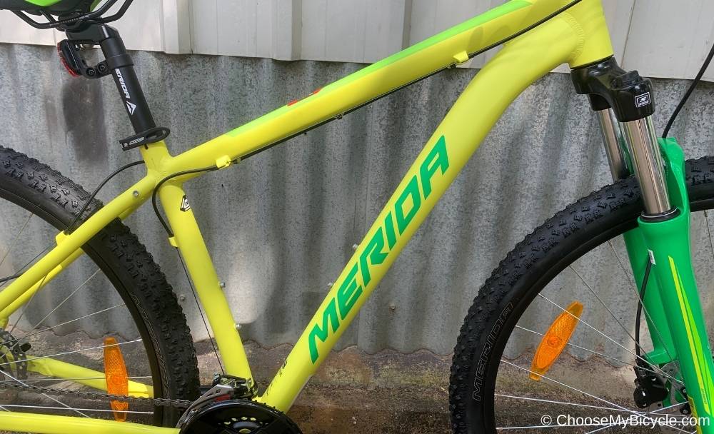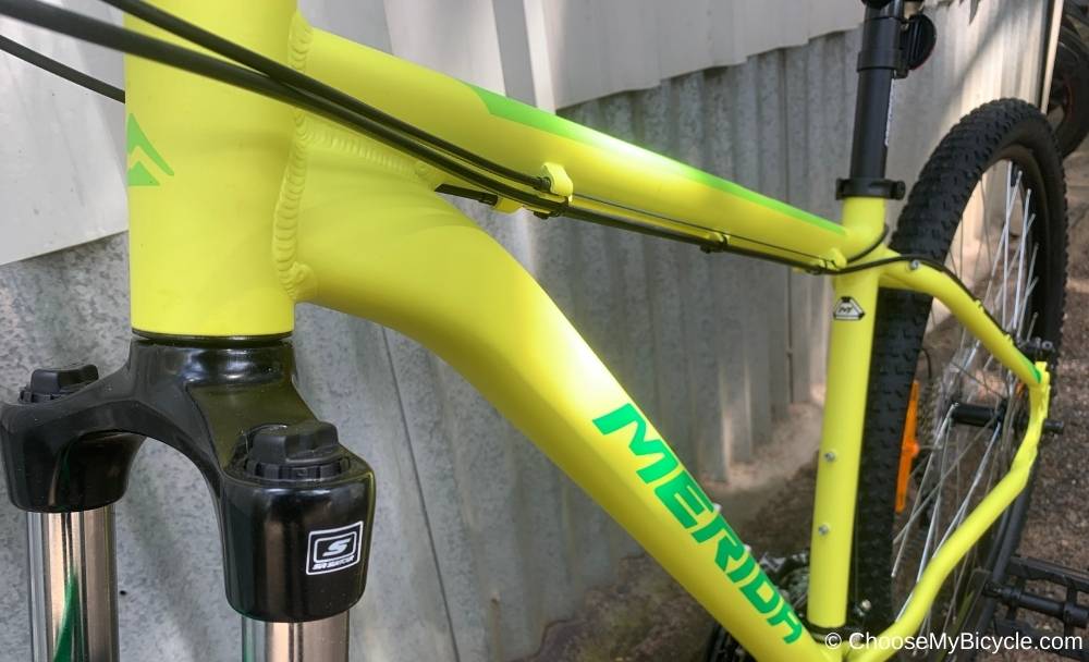 The Merida Big Nine 15 is built on an aggressive and strong Alloy frame. This frame has a slanting top tube, which makes the stand over height bigger than most standard hardtail MTBs. This helps the bicycle climb and roll over harsh trails without the frame taking a hit at the bottom bracket area. The top tube and bottom tube are fused together at the top near the headset, this makes the frame stronger in that area which might usually experience a lot of vibration of the surface when ridden on trails.The Suntour XCT front suspension fork comes with a massive 1m travel which made sure the bumps on trails were rolled over without any difficulty. A Lock-out option at this price is something we would have liked to see.