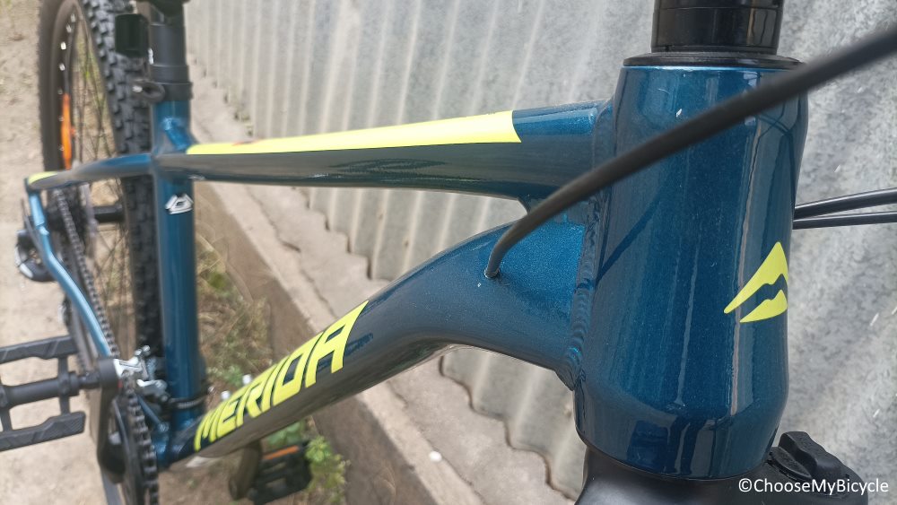The Merida Big Seven 2-3X (2022) is built on an aggressive and strong TFS Alloy frame. This frame has a slanting top tube which makes the stand over height bigger than most standard hardtail MTB's. This helps the Bicycle climb and roll over harsh trails without the frame taking a hit at the bottom bracket area. The top tube and bottom tube are fused together at the top near the headset, this makes the frame stronger in that area which might usually experiences a lot of vibration of the surface while riding on trails.The Suntour XCT3 front suspension fork came with a massive 1mm travel which made sure the bumps on trails were rolled over without any difficulty. The suspension lock-out was easy to use and helped with riding faster on flatter surfaces.