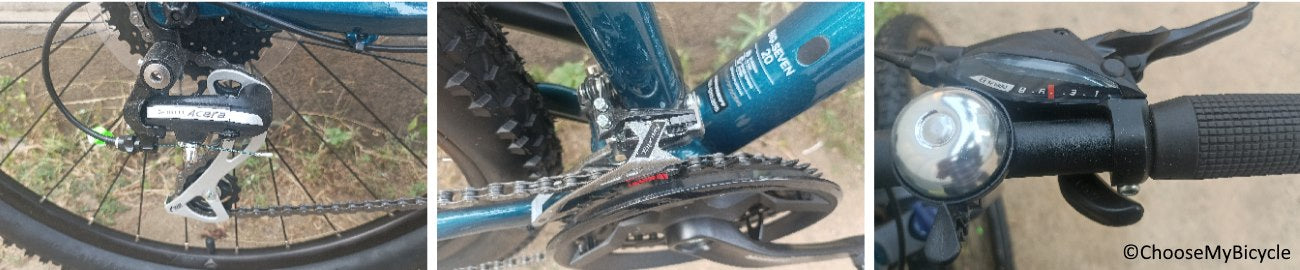 The Big Seven 2-3X (2022) is equipped with Shimano Tourney at front and Acera at the rear as derailleurs. The mid-level Shimano Tourney/Acera gear setup with a 3x8- Speed range is the perfect combination for fast and efficient trail riding. The 24-Speed drivetrain gave that extra bit of speed for the rider as well as enough range for steep climbs. The ST-EF55 Shimano EZ shifters were easy to operate.