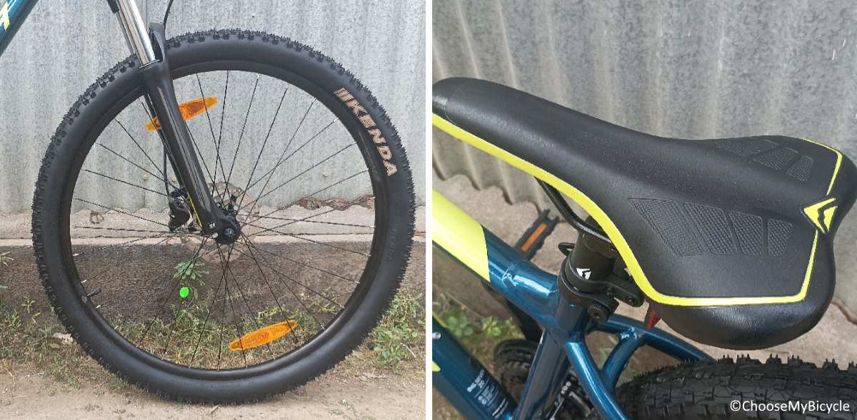 The Bicycle which I test rode came in a full Teal Blue frame with Lime graphics in a gloss paint finish. The full Lime coloured patch on top of the top tube gives a refreshing new outlook to the frame graphics. The colour coded graphics on the rims and saddle make the Bicycle look uniform in design. The bulky treads on the tires add to the much needed rugged look for this MTB.