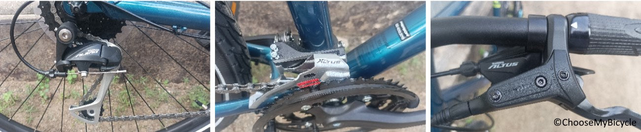 The Merida Crossway 1 (2022) comes with Shimano Altus 3-Speed at the front and Alivio 9-Speed at the rear as derailleurs. These mid to performance level Shimano Hybrid derailleurs worked smoothly during the test ride on rough urban roads when riding in traffic and over flyovers. Both the front and rear derailleurs shifted quickly and without any lag. The 27-Speed drivetrain gave a wide range for efficient climbs and quick acceleration.