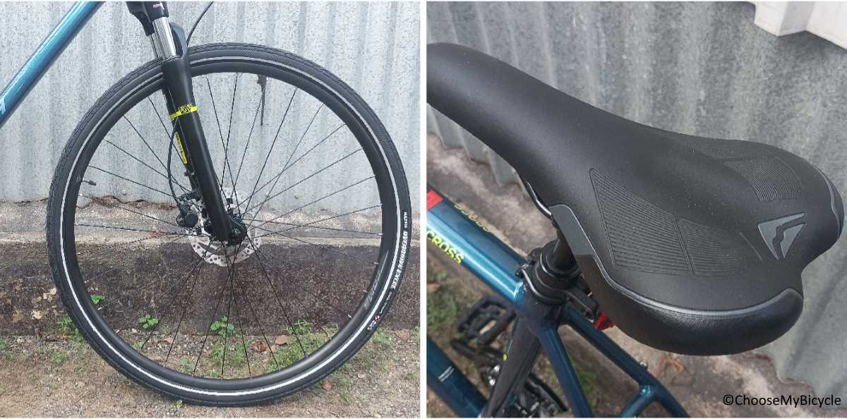The Crossway 1 (2022) comes with Maxxis Overdrive 7x4c with Merida stock rims. These tires have impressive tread patterns to give good traction on urban roads. The wheelset on the whole was lightweight and did contribute to keeping the weight of the Bicycle in check.The Cross Sport Saddle on this Bicycle was ergonomically designed making the sit bones placed on the widest points of the Saddle and thus making it comfortable during long rides even on bumpy surfaces.