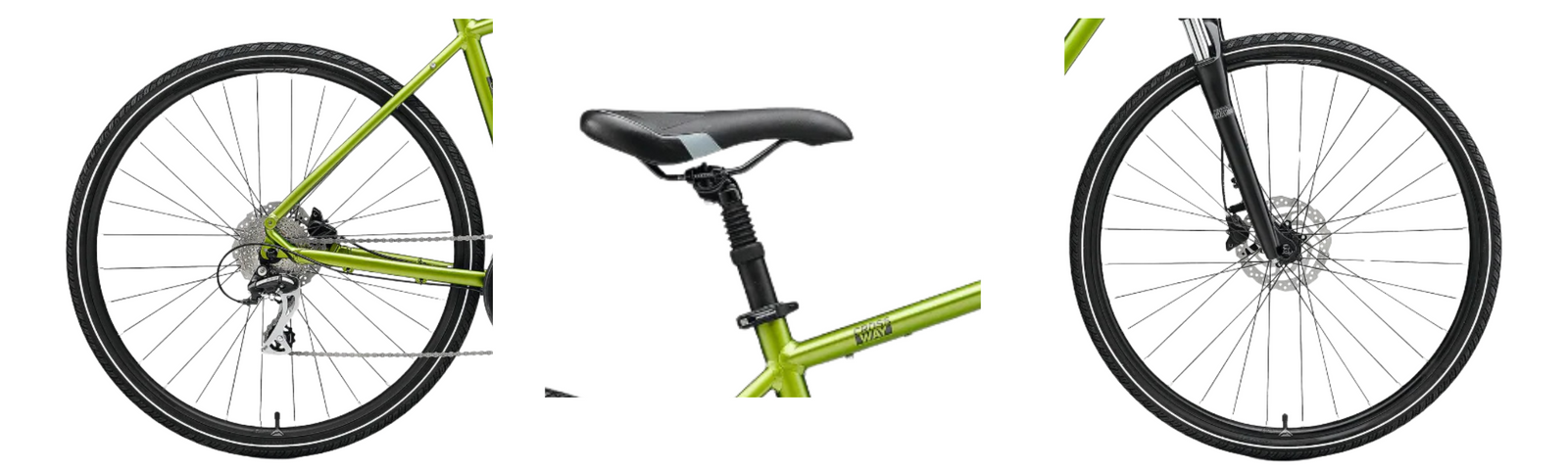Equipped with Power DS100 hydraulic disc brakes, which perform well even in humid / wet conditions, and offer sharp response. Good for traffic stops, sudden braking, and controlling speed downhill. “These brakes were powerful and had a fast response time when sudden braking in traffic and even on fast turns.”