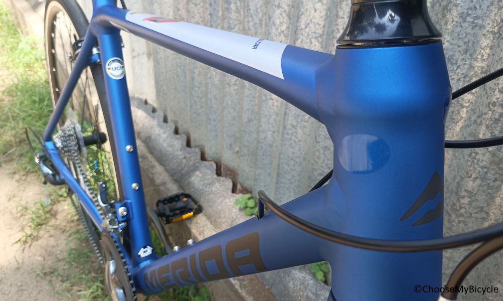 The Bicycle which we test rode came in a full Blue frame with Grey graphics. The matte paint job was smooth and enhanced the Blue frame colour. The internal cable routing made sure there was no cluster of cables hence giving a neat look around the front of the frame. The smoothly welded edges of the tube made the frame look like that of a much more expensive Road Bicycle.