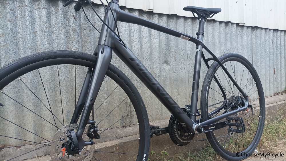 The Bicycle which we test rode came in a matte finish with Jet Black graphics. The sleek top tube and thin seat stays make this Bicycle look sleek. The flat handlebar and bladed fork gives it an aggressive look similar to a Road Bicycle. The graphics on the top tube and fork were elegant and aesthetic.