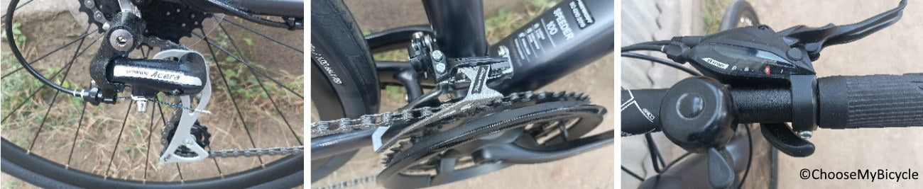 The Speeder 1's drivetrain is equipped with Shimano's Tourney 3-Speed at the front and Shimano Acera-X 8-Speed at the rear which worked smoothly during the test ride. The gears shifted down and up quickly and without any lag. They helped accelerate on flat roads with ease. The Shimano ST-EF55 trigger shifters were easy to operate.
