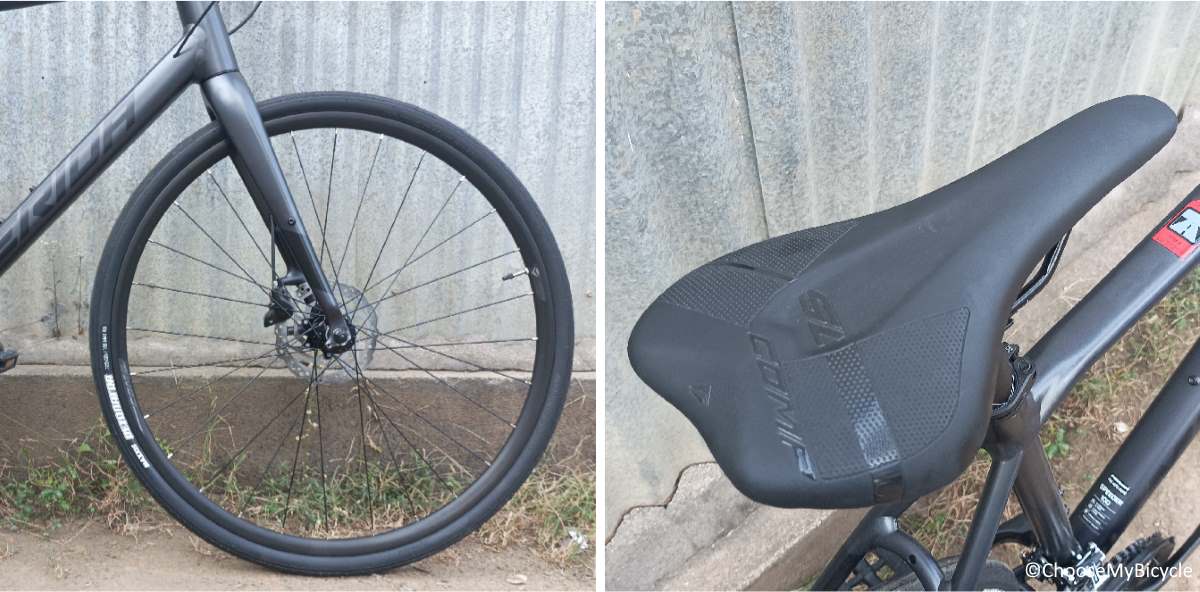 The Merida Speeder 1 (2022) comes with a pair of Maxxis Detonator 7x32C slick tires. Getting up to speed and maneuvering through traffic was easier with these tires, these tires also have a useful puncture protection layer.The Merida Comp saddle was incredibly comfortable with sufficient padding and the perfect width for comfortable and soreness free rides.