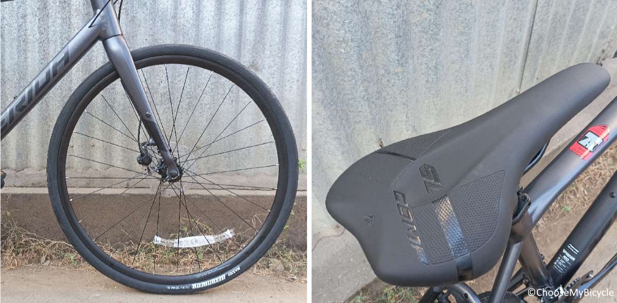 The Speeder 4 rolls on a pair of Maxxis Detonator 7x32C tires. Offering reasonable grip and puncture resistance, these tires are well suited for this road- focused hybrid. While they are not the fastest rolling treads going, they are dependable in a range of conditions.The Merida Comp SL stock Saddle may be flat and thinly padded, but its generous width makes it comfortable.