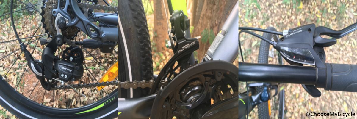 This hardtail MTB's gearing department comes with Shimano's Tourney TZ at the front and a standard Tourney at the rear. This 3x7-Speed drivetrain was entry-level but the shifting was smooth and is ideal for quick shifts on flat trails and urban roads. The Tourney 21-Speed trigger shifters were easy to shift with clear numbered gear indicators.