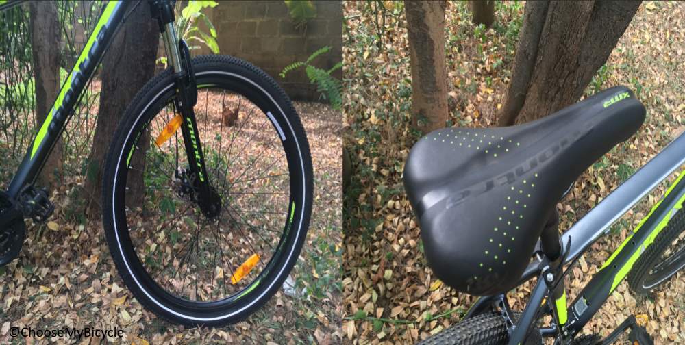 This Montra Backbeat (2019) rolls on a pair of 27.5” x 2.125” MTB tires. These tires were heavily treaded with a uniform tread pattern which made sure riding on flat trails was safe. The double walled Alloy rims were strong enough to take in a lot of hard hitting from the surface. The XMR PU Saddle was ergonomically designed to make sure the rider is comfortable and sore free on bumpy rides.