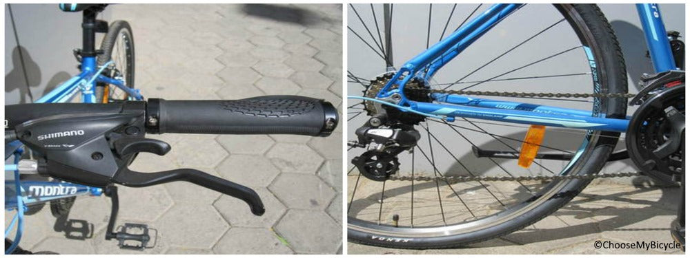 The Montra Blues 1.1 (2017) comes with a Shimano Altus as the front and rear derailleur. During the test ride the gearing on this bicycle worked seamlessly without any glitches. Once when I was climbing a bridge the quick shifting did ease the pedaling. The same goes for acceleration on flat roads as well, the Altus derailleurs did react quickly and I did not have to get off the saddle for the initial push. The gear transmission controls are taken care of by Shimano ST-EF5 21 speed shifters. These shifters were very close to the grips and hence were accessible easily without having to stretch out the fingers too much.