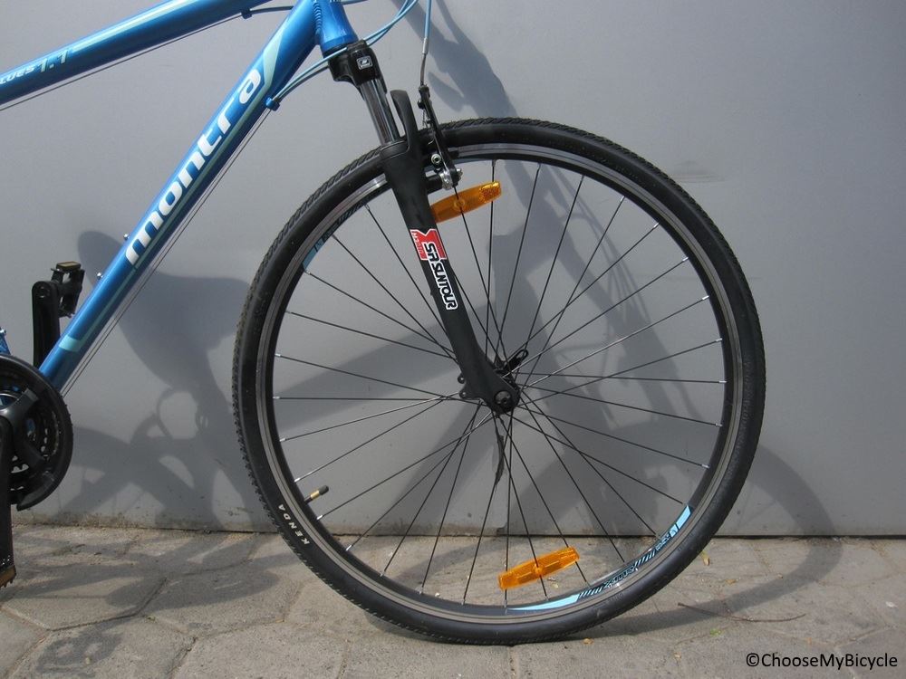 The Blues 1.1 (2017) comes with a hybrid 661 alloy frame. The frame is welded smoothly in the edges joining the tubes. Also the tubes are engineered in a way that there is very minimal material used in places, which don’t need reinforcements and extra alloy in places which will have high impact. This has considerably shaved the weight of the frame. The frame geometry is very comfortable and the slanting top tube makes this the perfect unisex bicycle.The Blues 1.1 (2017) comes with a SR Suntour front suspension fork with a 5mm travel. This fork worked well during the test ride but it is not going to fully absorb vibrations from the road. This is the same as found on the 216 Montra Blues 1.1.