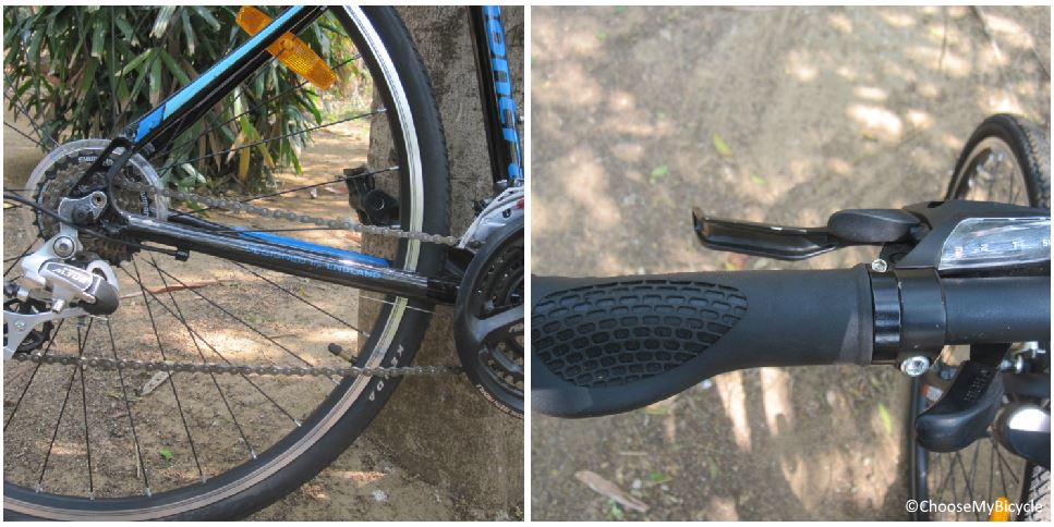 The Montra Blues 1.1 is a 21-Speed bicycle that is equipped with Shimano Altus Front and Rear Derailleurs. The shifting is controlled by Shimano Altus shifters. The derailleurs worked smoothly, with no hint of delays or lags when on the test ride. The range of gearing options makes tackling inclines and elevations easier, making this bicycle a solid option for touring and long distance riding. The gear transmission was on point, leaving no room for complaints in this department. The shifters are well placed and extremely responsive.