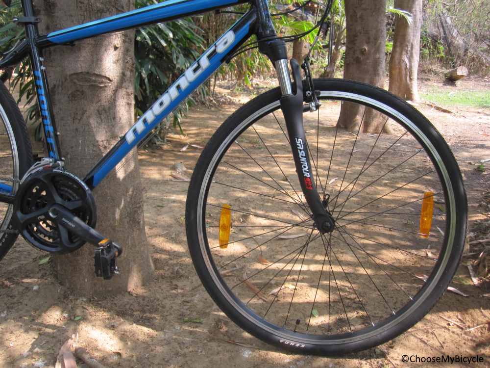 The Montra Blues 1.1 has been made using a 661 alloy frame which is lightweight and agile. The frame has been welded with precision, using reduced amounts of alloy thus adding to its light weight. The top quality welding is evident in the smooth and neat appearance of the edges. The frame has an ergonomic geometry, allowing for an upright riding position that ensures performance and comfort. The frame has mounting options for two water bottle holders. Additionally, it has mounting options for mudguards, in the front and rear, as well as a pannier rack at the rear. This makes this the perfect bicycle for long distance riding and touring. This bicycle is available in four sizing options - Small (15.5”), Medium (17”), Large(19”) and Extra Large (201”). This bicycle comes equipped with a front suspension fork. The SR Suntour M31 suspension fork comes with 5mm travel and a hydraulic lock out. The suspension works well to ensure absorption of shocks felt while riding on rugged, uneven terrains and over potholes. The hydraulic lockout is a plus point and adds to the versatility of this bicycle.