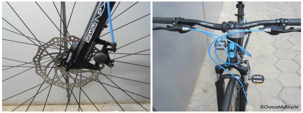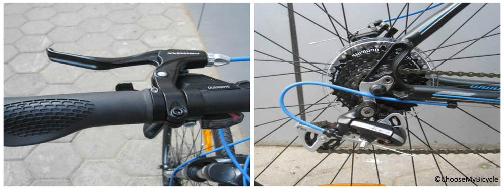 The sky blue colour on this bicycle is present in various places including the brake and gear cables.