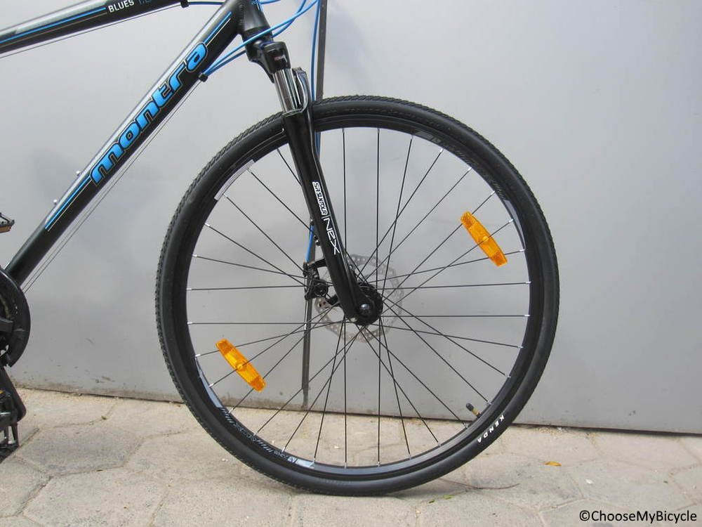 The Montra Blues 1.2 Disc 217 comes with a standard 661 alloy frame. This frame has been welded to perfection and this is evident in the neat welding of the edges. This has resulted in the frame using lesser alloy and hence able to keep a very competitive weight. The slanting top tube also makes this the perfect unisex hybrid bicycle. The geometry of this frame is comfort oriented and this makes touring on this bicycle easy.This bicycle comes with a front suspension fork. The SR Suntour M31 suspension fork comes with a 5mm travel and a hydraulic lockout. This is a great feature for this price. The suspension travel works well and makes the riding experience on bumpy roads comfortable.