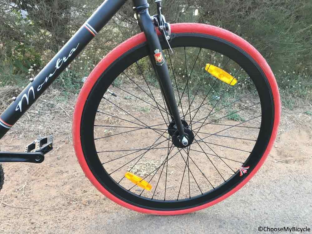 A fixed-gear bicycle or fixed-wheel bicycle, commonly known in some places as a fixie is a bicycle that has a drivetrain with no freewheel mechanism. The freewheel was developed early in the history of bicycle design but the fixed-gear bicycle remained the standard track racing design. Targeted directly towards the urban cyclist, this Fixie falls under the range of what Montra call “Urban Sport”. The category is defined by Montra as “If you are the kind of rider that commutes for fun, likes to roll down to the park over the weekends, and takes the occasional charity ride, you need something as versatile as you. Montra Urban Sport bikes feature comfortable geometry's and lightweight frames, so you can make your ride exactly what you want it to be”. The moment I laid my eyes on the Montra Fixie (2017), I was supremely delighted, the bicycle looks amazing on the first glance. The colour combinations and the paint finish are just absolutely spot on. The red tires are very unique and will definitely make heads turn while riding around the city. Overall on first looks I think the Montra Fixie has won 5% of the review battle.