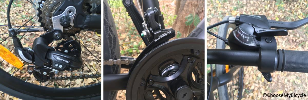 The Shimano Tourney 21-Speed derailleurs were sufficient for city rides.