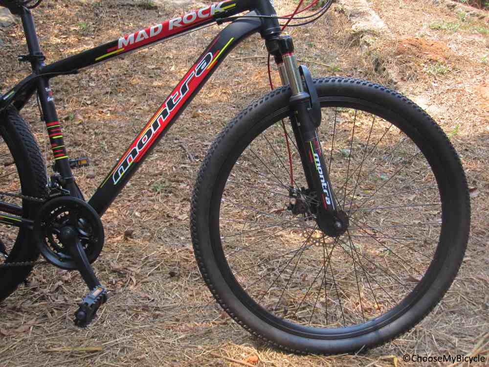 The Montra Madrock 26"" comes equipped with Wanda P1197 26” x 1.95” tires. The dimensions of the tires are standard when it comes to 26” bicycles. The tires are well treaded, providing additional stability and grip when on uneven surfaces. When tested on a smooth surface, the tires were fast rolling with enough traction to provide stability in wet riding conditions and on turns. The wheels do not have a Quick Release option, which could be slightly time consuming when tackling a puncture while on a ride. Though, I would not view this as a significant hindrance given the specs and price point of this bicycle. The Montra Trail saddle that comes on this bicycle is commendable. When on the test ride, we found the saddle to be extremely comfortable, without any unnecessary bulk. The seatpost does not have a Quick Release for the saddle. The overall ride quality of this bicycle was satisfactory for a leisure MTB.
