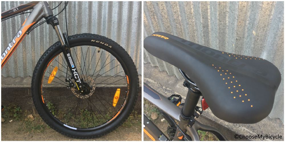 This hardtail MTB which I test rode came in a full Black primary colour on the frame with Orange and White graphics. The gloss paint job is of good quality with a shine to it. The design graphics are simple and elegant with minimal work. The slanting top tube, new seat stay design and heavy treads all make this bicycle aesthetically pleasing. The colour coded brake cables and saddle enhance the look of this bicycle.