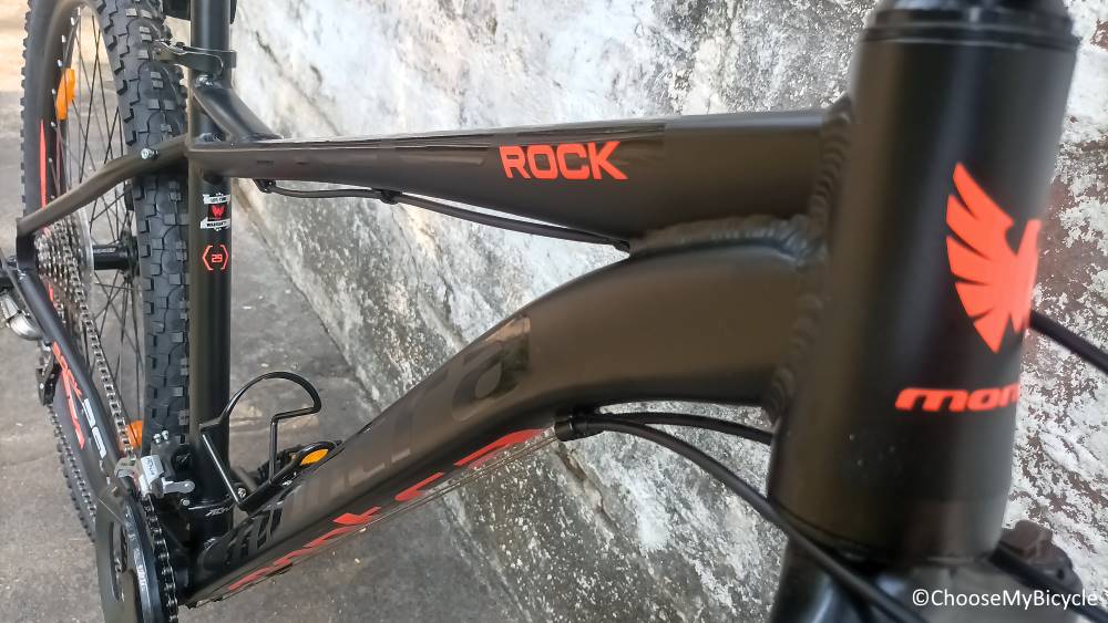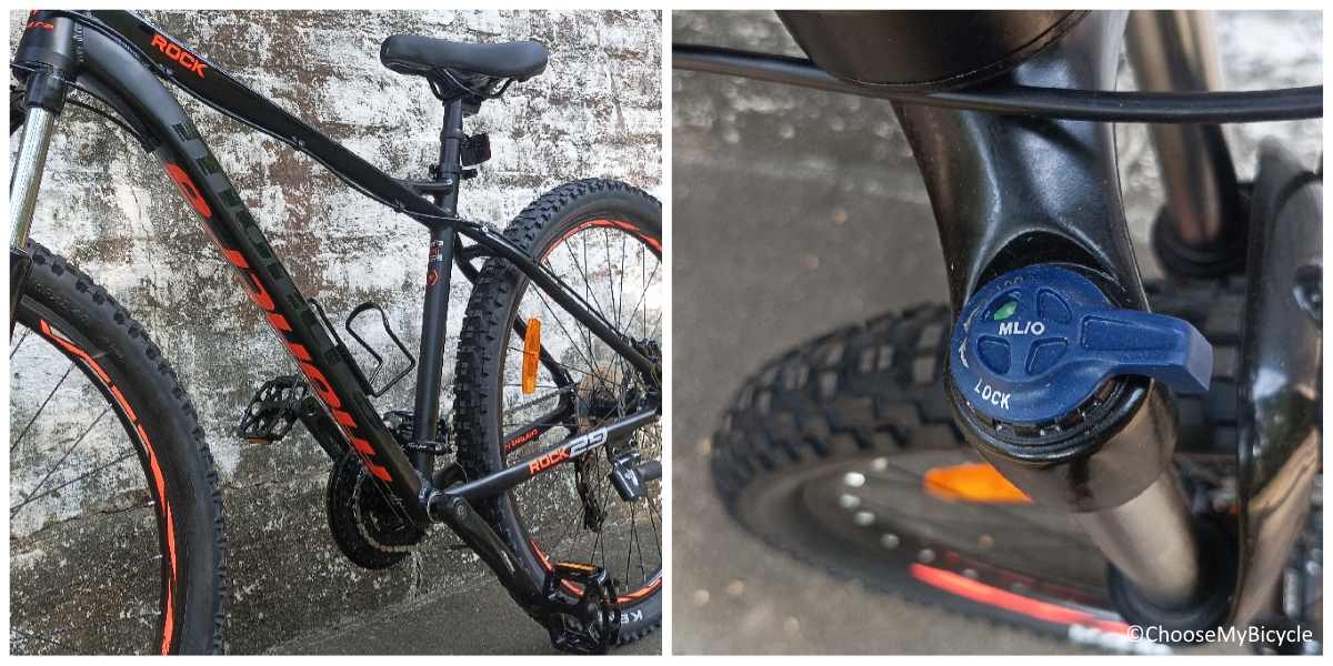 This Hardtail MTB which we test rode came with a Dark Grey primary colour with Black and Neon Orange as the secondary colours. The matte finish paint job enhanced the colours. The gloss stickers on the matte frame were stylish and elegant. The slanting top tube, thin tubes and heavy treads all make this bicycle look like a rugged MTB. The bulky tires enhanced the rugged MTB look of this Cycle.