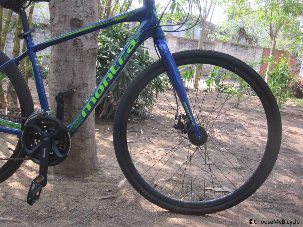 The Timba 1.1D was easily one of the few eye catchers amongst the 218 Montra range. The bicycle which I test rode came in a full blue frame with green graphics. The gradual change from sleek to bulge on the top and bottom tubes certainly made the bicycle look stylish. The checked line pattern on the frame and the top quality gloss paint job definitely enhanced the aesthetics of this bicycle.