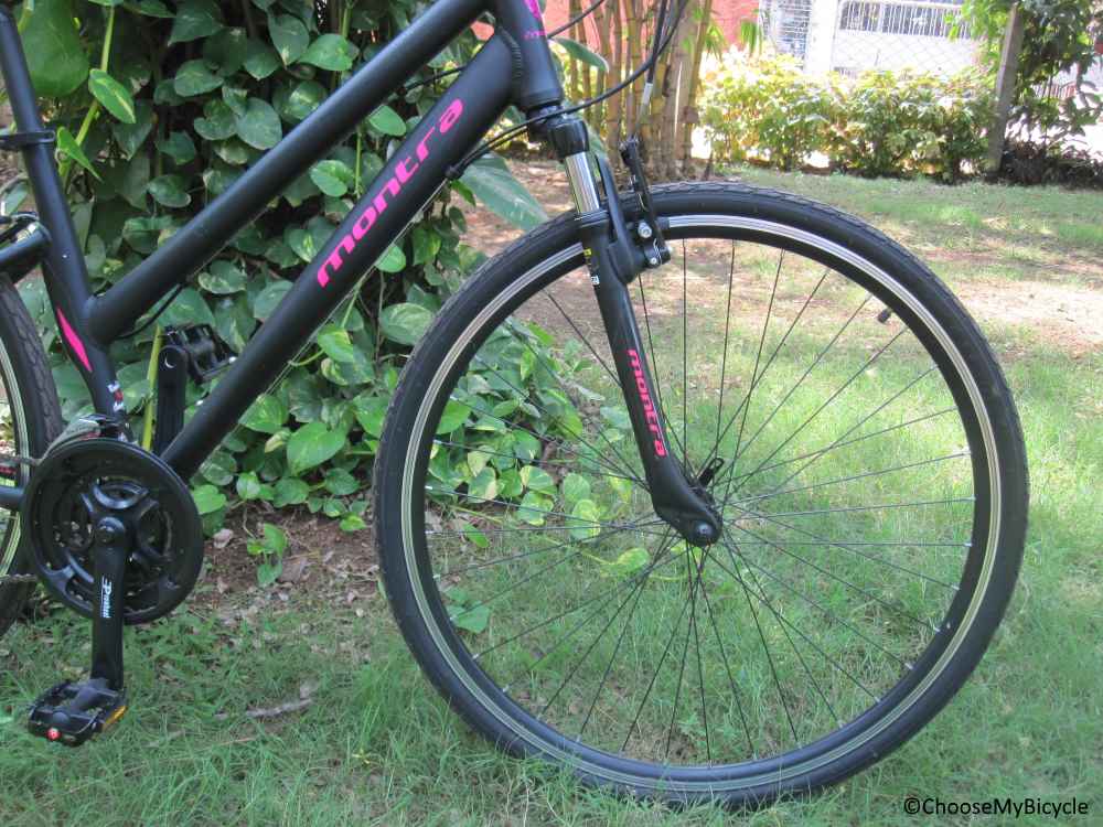 The Montra Trance W has been made using a 661 alloy frame, making it lightweight and sturdy. The frame has been welded to perfection, evident from the top quality, neat edges as seen on the frame. The welding allows for an overall decreased amount of material used, thereby adding to the light weight of the bicycle. The bicycle has a downward sloping top tube, making it a low step through frame, which is in line with woman specific frame designs, making this a perfect bicycle for women. The frame has a single bottle holder mounting option.The bicycle comes with a side stand and provisions for mudguards at the front and the rear. Additionally, the frame has lifetime warranty from Montra. The Montra Trance W comes with a Zoom front suspension fork. This suspension fork has 5mm travel, which is the most basic amount of travel one can expect out of a suspension fork. However, the suspension was effective when tested on rugged, uneven surfaces transferring minimal vibrations to the saddle.