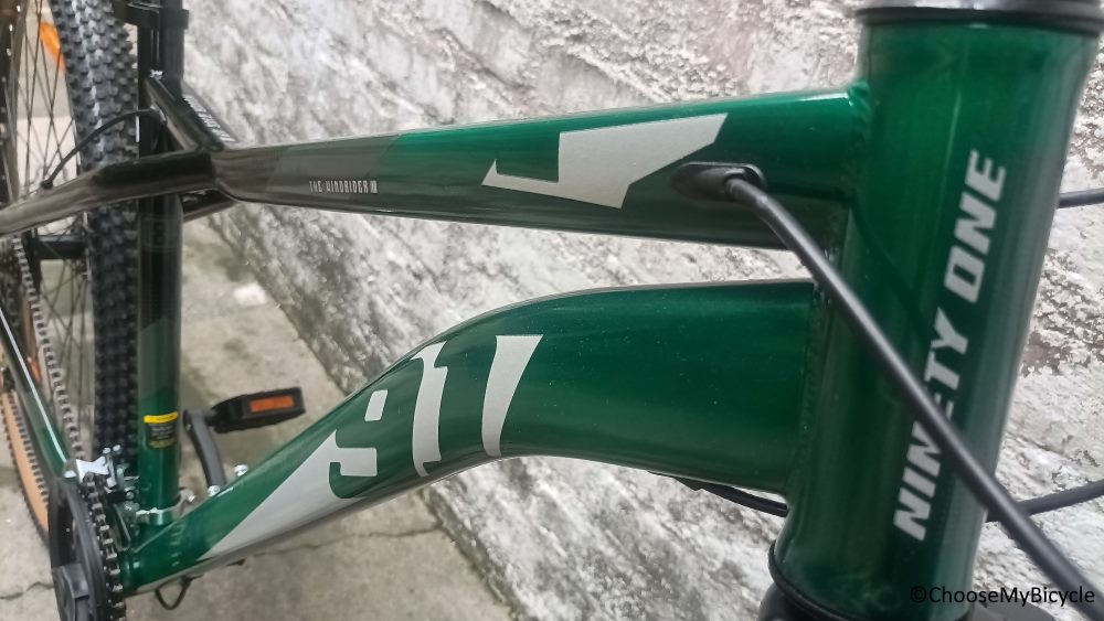 The Windrider 29T Multi-Speed from Ninety One which we test rode came with Forest Green as the primary colour with White as the secondary colour for the graphics and text. The gloss finish paint job was top notch in quality. The black saddle with bold ‘91’ and the 91 logo on the bottom tube were definitely eye catching. The colour coded fork enhanced the aesthetics of this Bicycle.
