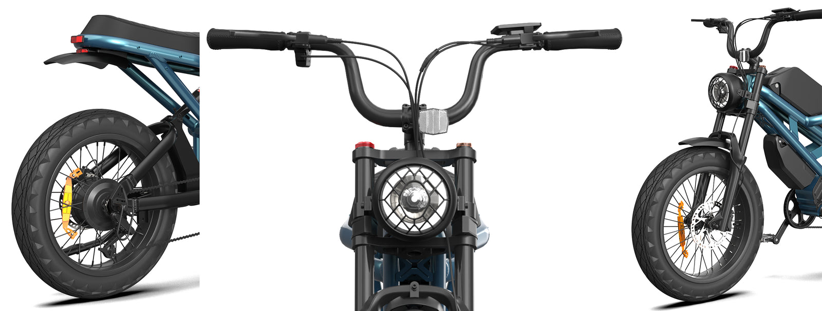 The Nuze Vybe rolls on 20" x 4" Hartex nylon tires with a hybrid tread pattern, providing excellent grip on urban roads and light trails. The wide tires offer enhanced stability and cushioning, making the ride comfortable and efficient.