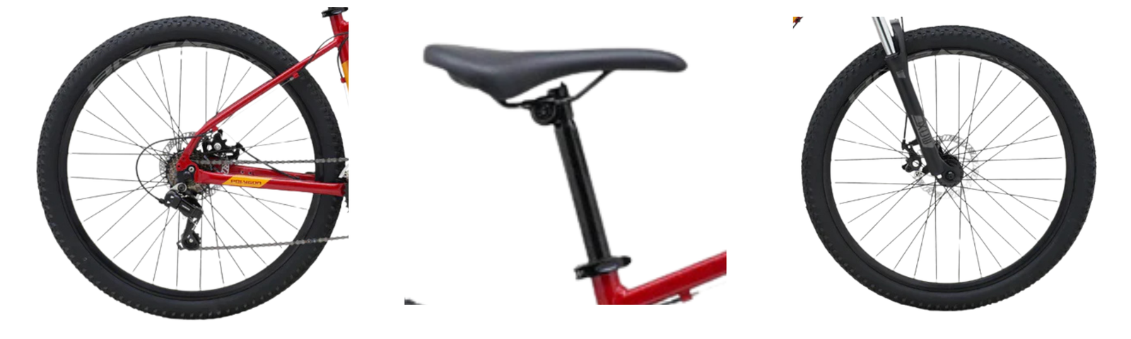 The bike rolls on 27.5" double-wall alloy rims laced to alloy hubs, offering a balance of strength and lower rolling resistance. They are paired with 27.5" x 2.1" heavily treaded MTB tires, which are praised for being fast-rolling while maintaining good traction on a variety of surfaces. The stock Foming Steel Rail saddle is comfortable out of the box and appropriately sized for the bike’s target audience, aiming to reduce saddle soreness.