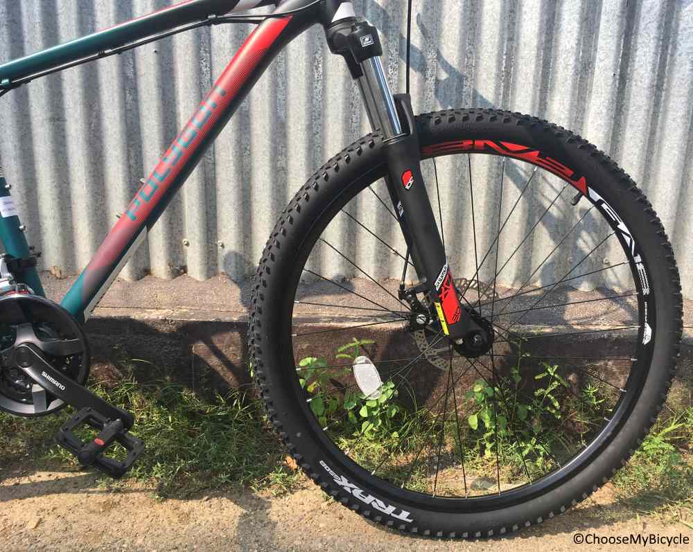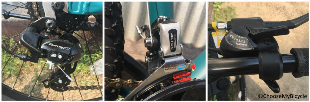 This hardtail MTB comes with a unique combination of Shimano Tourney at the rear and Shimano Altus at the front as derailleurs. This is unique because, usually when there is a component mix in the drivetrain, the lower ranked component is in the front and higher ranker component at the rear thus making the smaller gear changes better at the rear. In this case the Altus at the front has actually made the bigger gear jumps easy and smooth to change with no lags. Altus and Tourney are entry-level MTB components but they perform well for flat trail riding and urban commuting. The 24-Speed trigger shifters were easy to use.