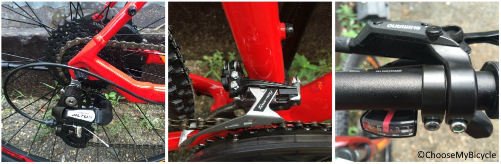 The Shimano's Tourney and Altus handle the 24-Speed drivetrain on this hybrid bicycle. The Tourney at the front is the most basic gearing component in Shimano's hybrid hierarchy and Altus is the one above Tourney. The performance of gears during the test ride was smooth but the Tourney in the front is a bit slow to react, especially while shifting up. For the price of this bicycle, an Altus/Altus or an Altus/Acera would have made sense as the Tourney does bring down the overall gearing performance.