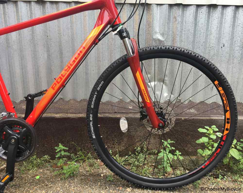The Heist 2 which I test rode came in a full red colour frame with orange graphics in many places. The line pattern design on both the top and bottom tubes were new and refreshing. The gloss paint job was of top notch quality and has a good shine to it. The contrasting brown colour fork and colour coded rims improves the aesthetic appeal of this bicycle.