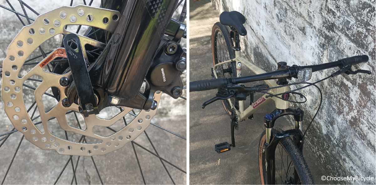 Shimano's MT21 Hydraulic Disc brakes handle the braking performance on the Polygon Heist X5 (2022). These brakes were powerful and balanced on urban roads and felt safe to use even at top speeds.The Entity 7mm handlebar was wide and flat with MTB characteristics and no raise from the middle. This enables more control over the Bicycle while compromising a bit on the straight back riding posture.