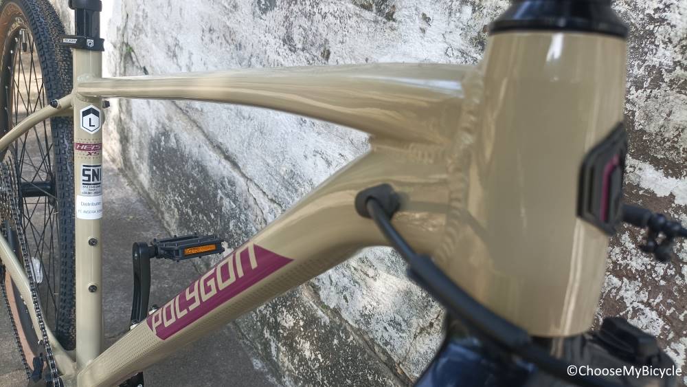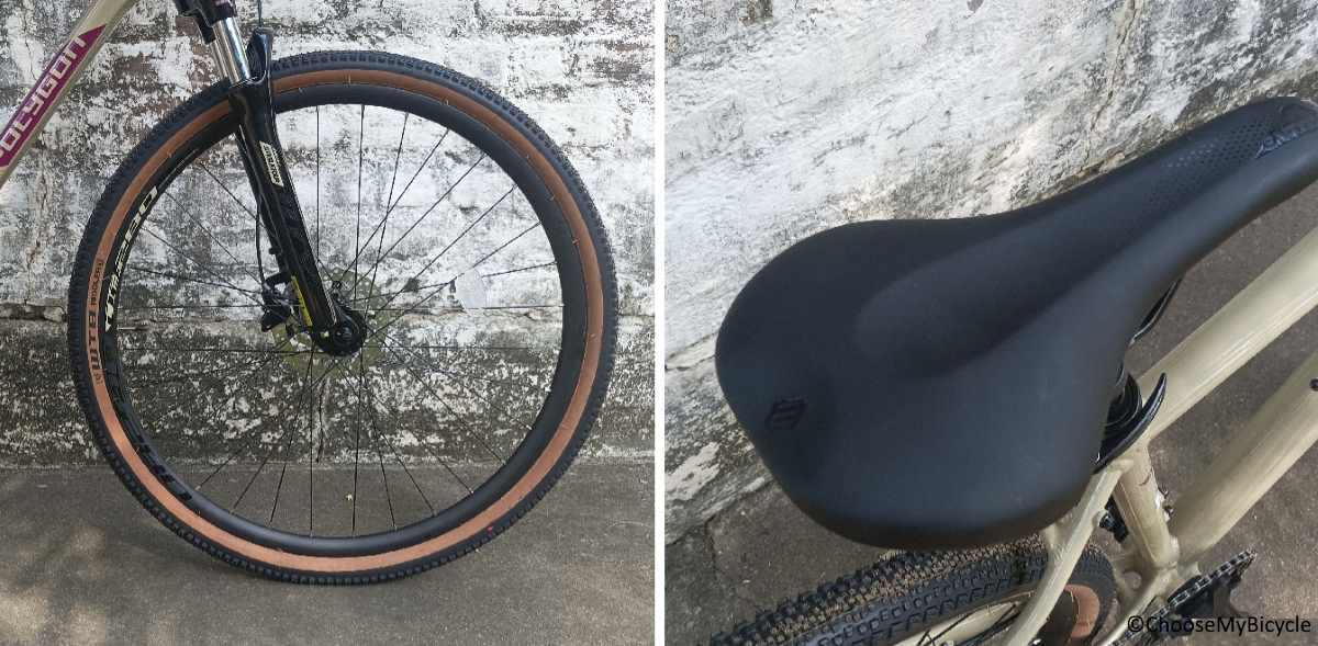 The Heist X5 (2022) which we test rode came in a full Cream coloured frame with Dark Pink graphics in a few places. The minimalistic design on both the top and bottom tubes were elegant. The gloss finish paint job was of top notch quality and gave a smooth outlook. The contrasting black coloured fork and colour coded rims made the Bicycle aesthetic.