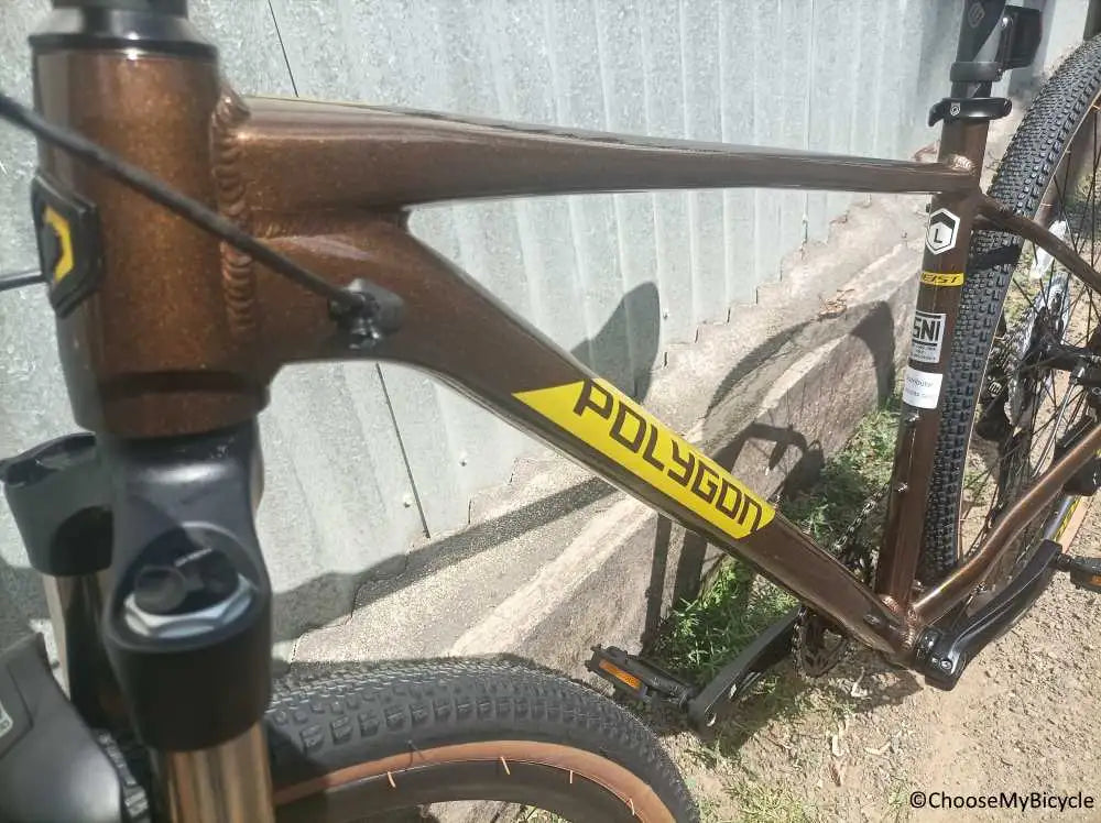 The Heist X7 (2022) which I test rode came with a Brown coloured frame with Yellow and Black graphics in a few places. The minimalistic design on both the top and bottom tubes were elegant. The gloss finish paint job was of top notch quality and gave a smooth outlook. The contrasting Black coloured fork and colour coded rims made the Bicycle aesthetic in appearance.
