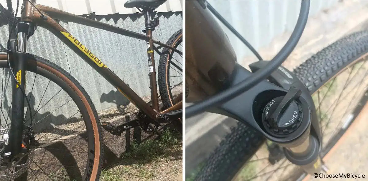 This is a Cross Hybrid which comes with a Suntour front suspension fork. The travel on the fork is just about enough for the rough patches on city roads and flat trails. The suspension lock-out feature helped make the ride faster on flatter roads.