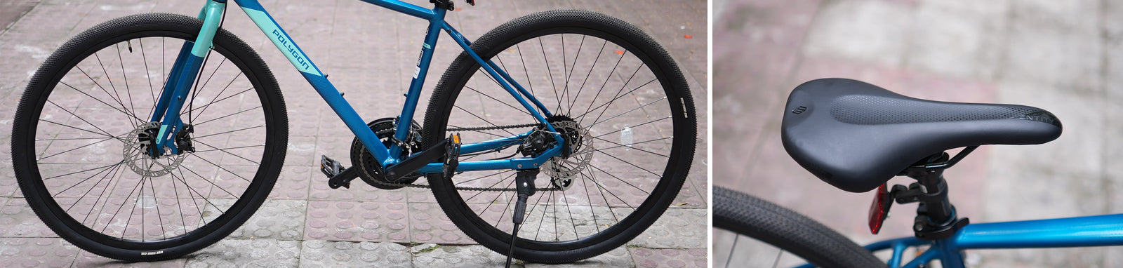 The Polygon Path 2 is fitted with 7x4c tires, which strike a perfect balance between speed and comfort. These tires are fast-rolling, making it easy to maintain momentum on flat city roads, while their width provides stability and grip. The tread pattern is designed for urban use, offering good traction on both dry and wet surfaces.The saddle on the Path 2 is ergonomically designed to provide maximum comfort during long rides. It features ample padding and a shape that supports the rider's sit bones, reducing discomfort on extended commutes. The seat post is easily adjustable, allowing riders to find their optimal seating position for a comfortable and efficient ride.