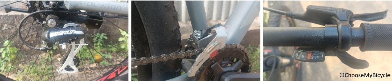 Shimano's Altus at the front and Acera at the rear form the drivetrain on the Polygon Premier 4 (2022). These gearing components from Shimano were mid-level MTB components and were smooth and quick in transmission during the test ride. The 2x8-Speed gear range was enough for steep climbs and quick accelerations.