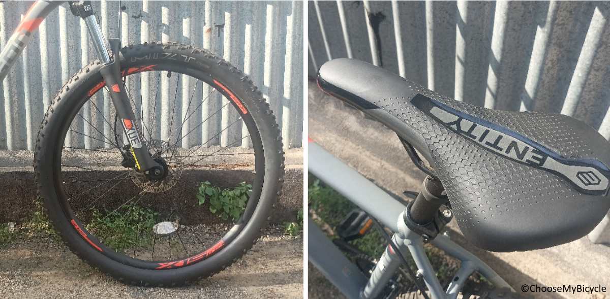 This hardtail MTB rolls on a pair of Entity Mitz 27.5” x 2.25” tires. These tires are heavily treaded with bulky treads which cover the tires evenly and rolls fast on flatter surfaces. The Entity MTB saddle is perfectly designed and is ergonomic to make sure the rider is safe and sore free on a bumpy ride.