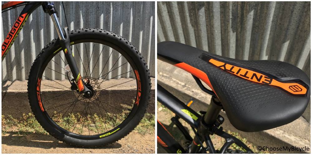 The Tektro HD-M275 Hydraulic Disc brakes on this bicycle were as powerful brakes as it can get on a mid-level hardtail MTB. During the test ride, the brakes were powerful and felt balanced to use on both wet and dry conditions.The 76mm Entity branded handlebar was lengthy and not the most comfortable if you are looking to commute with it. But they are perfectly suited for trail races on single tracks with drops and inclines.
