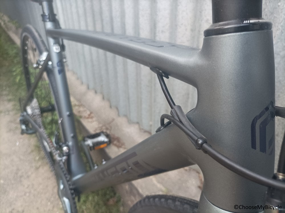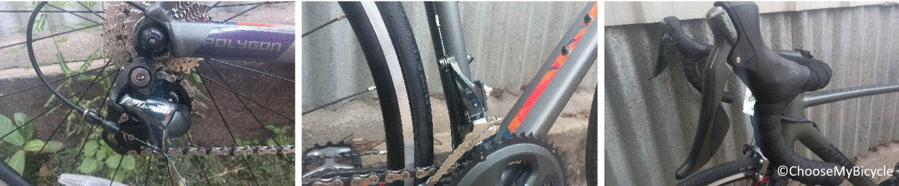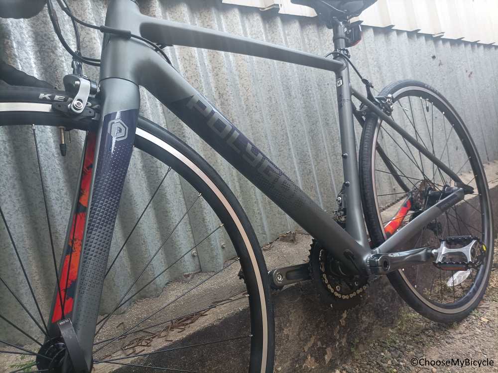This Road Bicycle from Polygon which I test rode came in a full Grey frame with Dark Grey as the secondary colour. The matte finish paint job quality was smooth with aesthetic graphics. Internal cable routing for the gears made sure the Bicycle looked neat and also increases the life of the cables.