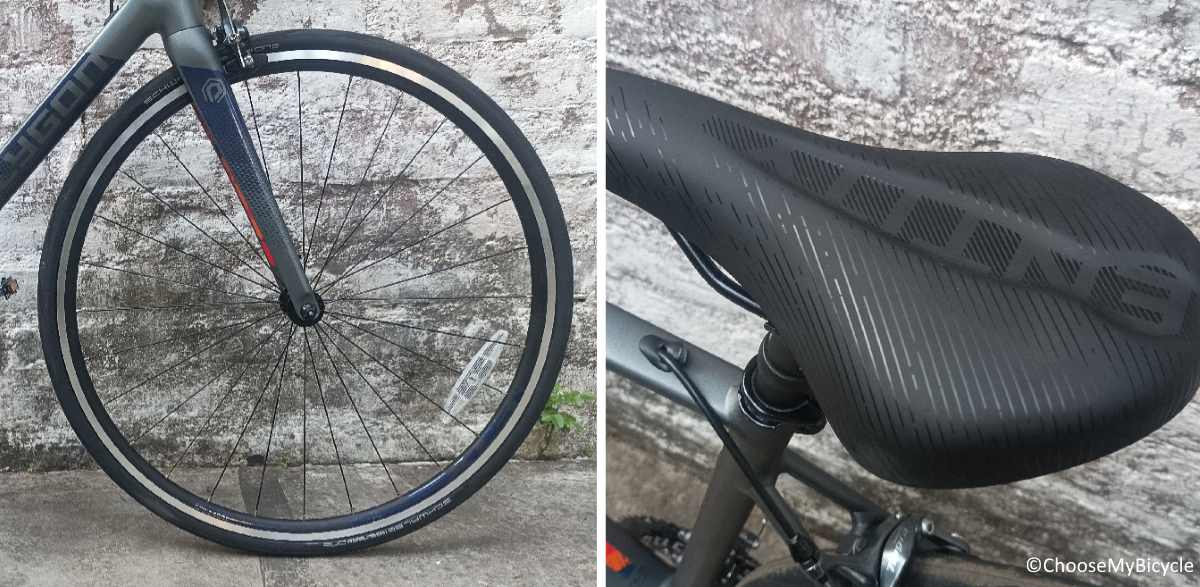 The Schwalbe 7x28C Road tires were perfect for racing and climbing on smooth tarmacs. The rubber compounds were strong and does give a long life, thus making it value for money.The Entity stock saddle was designed ergonomically for an Endurance Road Bicycle to make sure the rider can be seated for long hours without experiencing any soreness.