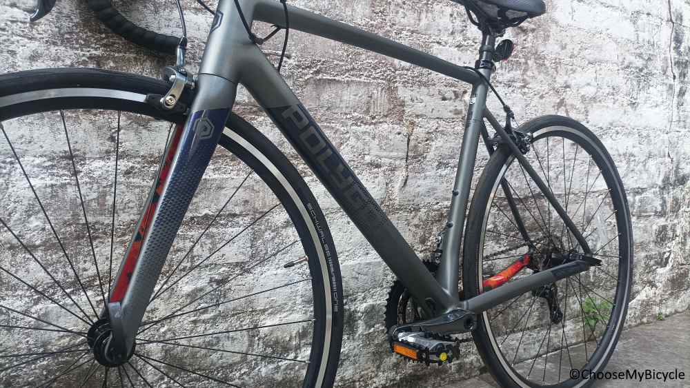 This Road Bicycle from Polygon which we test rode came in a full Grey frame with Dark Grey as the secondary colour. The matte finish paint job was smooth with aesthetic graphics. Internal cable routing for the gears made sure the Bicycle looked neat. The Orange graphic strip on the bottom tube is new and refreshing.