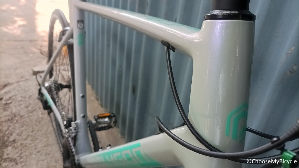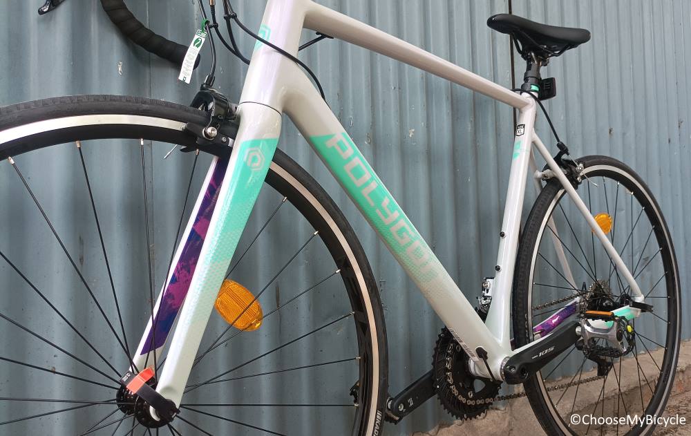This Road Bicycle from Polygon which we test rode came in a full White frame with a lighter shade of Green and Purple as the secondary colours. The creamy shade of Gloss White on this frame was unique and looked refreshing. Internal cable routing for the gears made sure the Bicycle looked neat and also increases the life of the cables.