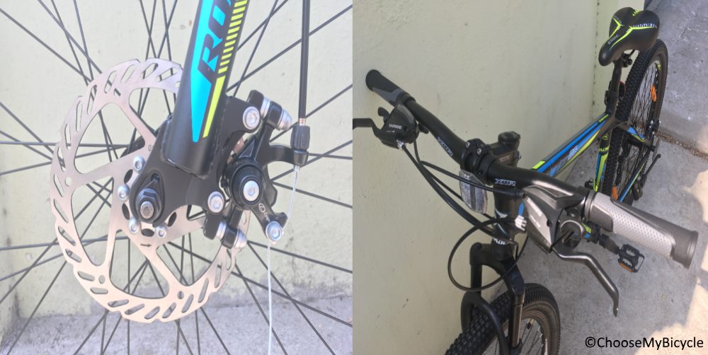 This hardtail Urban MTB that I test rode came in a full Black frame with Blue and Neon Green as the secondary colours for graphics and text. The matte finish paint job was smooth and top notch in quality. The wide handlebar, heavily treaded tires and bulky bottom tube gave the bicycle full-fledged MTB characteristics. The colour coded rims and saddle enhanced the aesthetic s of this bicycle.