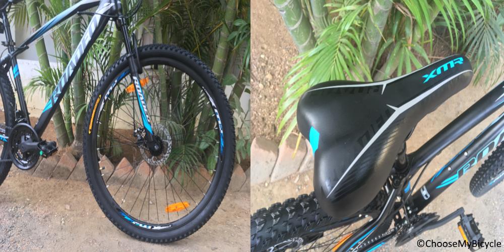 This Fugitive rolls on a pair of Wanda King 29” x 2.125” MTB tires that are fit onto Double Walled XMR Alloy rims. The treading on the tires was bulky and evenly spaced which enables the bicycle to roll over rough surfaces with ease. The XMR PU Saddle was padded enough to keep the rider comfortable and was also filled with colour coded graphics which made it look aesthetic.