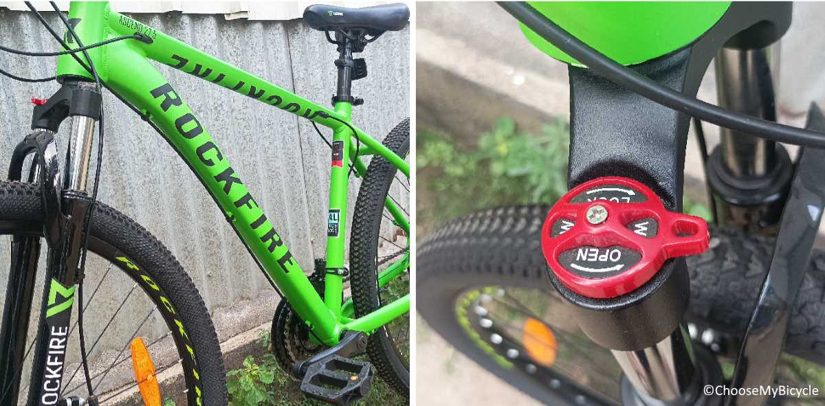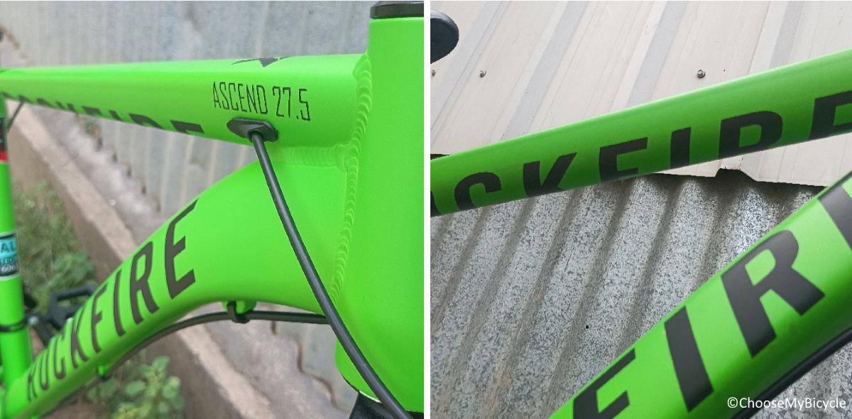 When it comes to design, Rockfire is on par with any international brand. The Ascend 27.5 which I test rode came in a full Green matte finish primary colour on the frame with Black as the secondary colour for graphics and text. The internal cable routing made the Bicycle look neat and the colour coordinated rims and suspension made it look aesthetic.