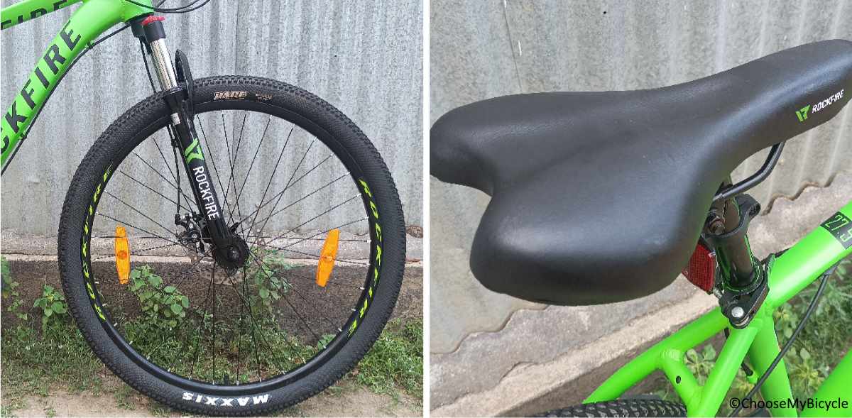 The Maxxis Pace MTB tires impressed us during the test ride. The 27.5” x 2.1” tires were heavily treaded with bulky buttons which covered the edges as well. These tires were fast rolling on flatter surfaces and could handle rough patches with ease.The Rockfire Trail Saddle is wide with enough cushioning for soreness free ride.