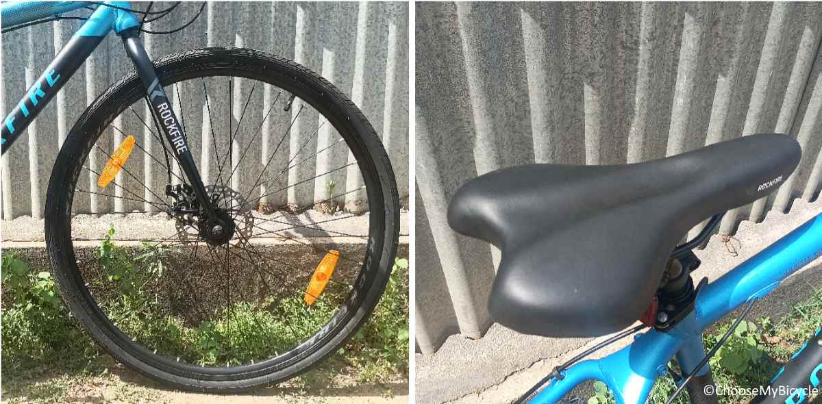 The Rockfire Hustle Sport rolls on a pair of DSI 7x35c tires. These tires were well treaded and at the same time the wheelset was lightweight thanks to its Double Walled Alloy rims. Even on slightly rough non-tar surfaces these tires rolled over without much difficulty. The Sport saddle was perfect in shape and also had outer layer material which was non-slippery.